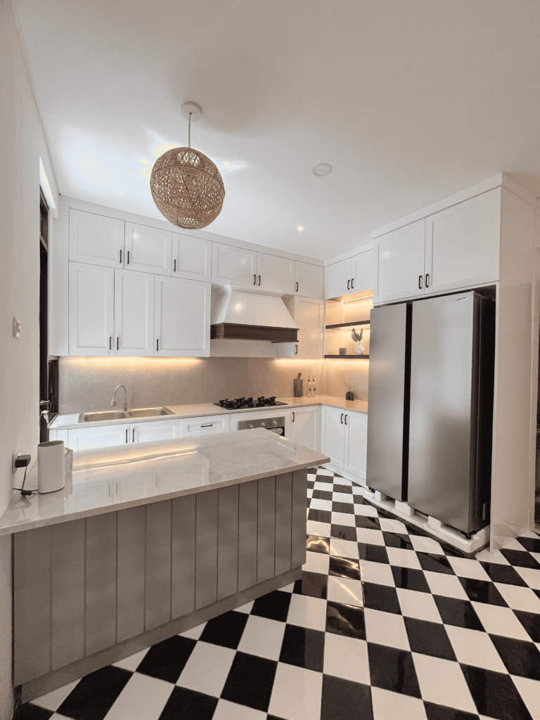 The kitchen features crisp white shaker-style cabinets with black metal handles, open shelving with ambient lighting, and a woven rattan pendant light above the island for warmth. Marble-effect countertops and backsplash add a touch of luxury, while a white-paneled range hood with wood accents introduces a rustic touch. Black and white checkered tiles complete the