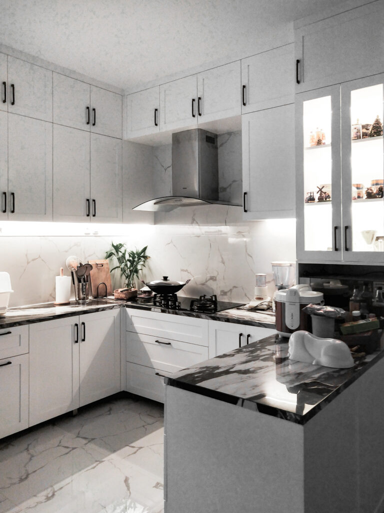 The marble-patterned countertops serve as the centerpiece of the design, exuding luxury and elegance with their high-contrast black veining. The backsplash continues the marble theme, creating a cohesive and seamless visual flow with the countertops. A sleek, stainless steel range hood is integrated above the stovetop, adding functionality and complementing the clean design lines. Minimalist